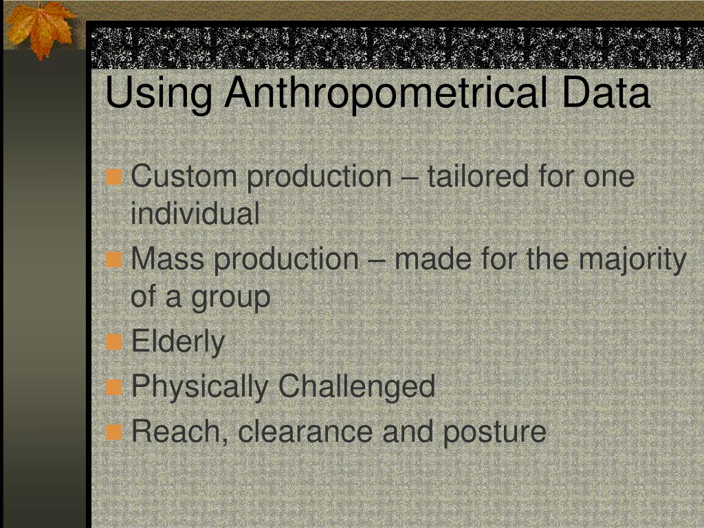 Using Anthropometrical Data • Custom production – tailored for one individual • Mass production – made for the majority of a group • Elderly • Physically Challenged • Reach, clearance and posture
