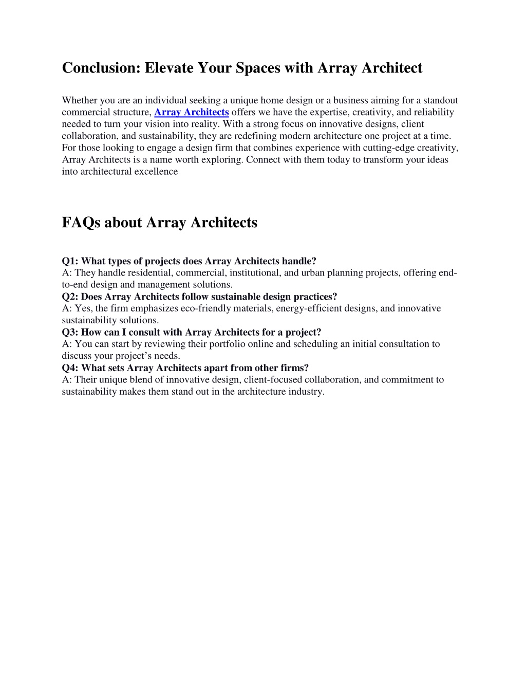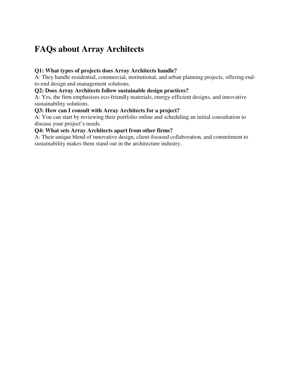 5. FAQs about Array Architects Q1: What types of projects does Array Architects handle? A: They handle residential, commercial, institutional, and urban planning projects, offering end- to-end design and management solutions. Q2: Does Array Architects follow sustainable design practices? A: Yes, the firm emphasizes eco-friendly materials, energy-efficient designs, and innovative sustainability solutions. Q3: How can I consult with Array Architects for a project? A: You can start by reviewing their portfolio online and scheduling an initial consultation to discuss your project’s needs. Q4: What sets Array Architects apart from other firms? A: Their unique blend of innovative design, client-focused collaboration, and commitment to sustainability makes them stand out in the architecture industry.