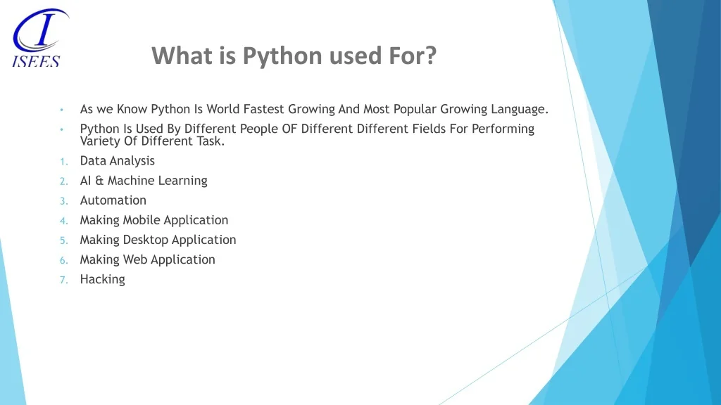 What is Python used For? • As we Know Python Is World Fastest Growing And Most Popular Growing Language. • Python Is Used By Different People OF Different Different Fields For Performing Variety Of Different Task. • Data Analysis • AI & Machine Learning • Automation • Making Mobile Application • Making Desktop Application • Making Web Application • Hacking