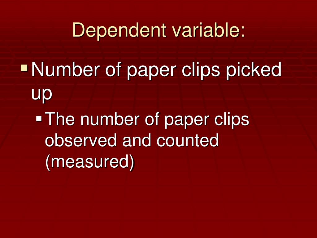 Dependent variable: • Number of paper clips picked up • The number of paper clips observed and counted (measured)