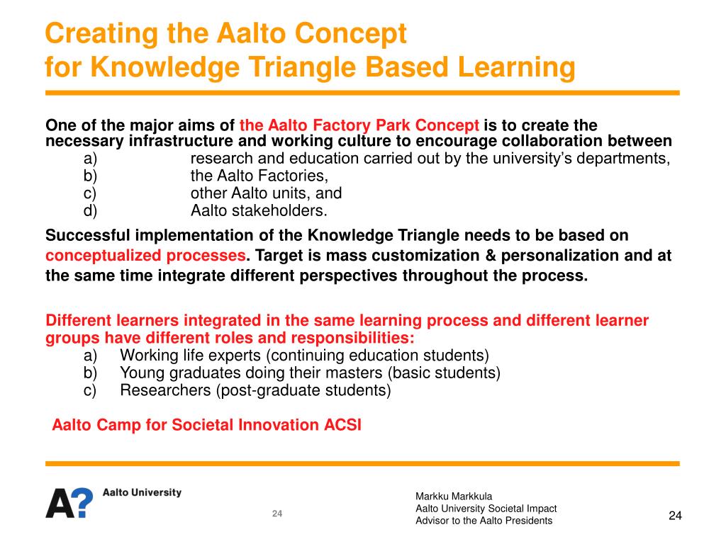 Creating the Aalto Concept for Knowledge Triangle Based Learning One of the major aims of the Aalto Factory Park Concept is to create the necessary infrastructure and working culture to encourage collaboration between • research and education carried out by the university’s departments, • the Aalto Factories, • other Aalto units, and • Aalto stakeholders. Successful implementation of the Knowledge Triangle needs to be based on conceptualized processes. Target is mass customization & personalization and at the same time integrate different perspectives throughout the process. Different learners integrated in the same learning process and different learner groups have different roles and responsibilities: • Working life experts (continuing education students) • Young graduates doing their masters (basic students) • Researchers (post-graduate students) Aalto Camp for Societal Innovation ACSI • Markku Markkula • Aalto University Societal Impact • Advisor to the Aalto Presidents 24