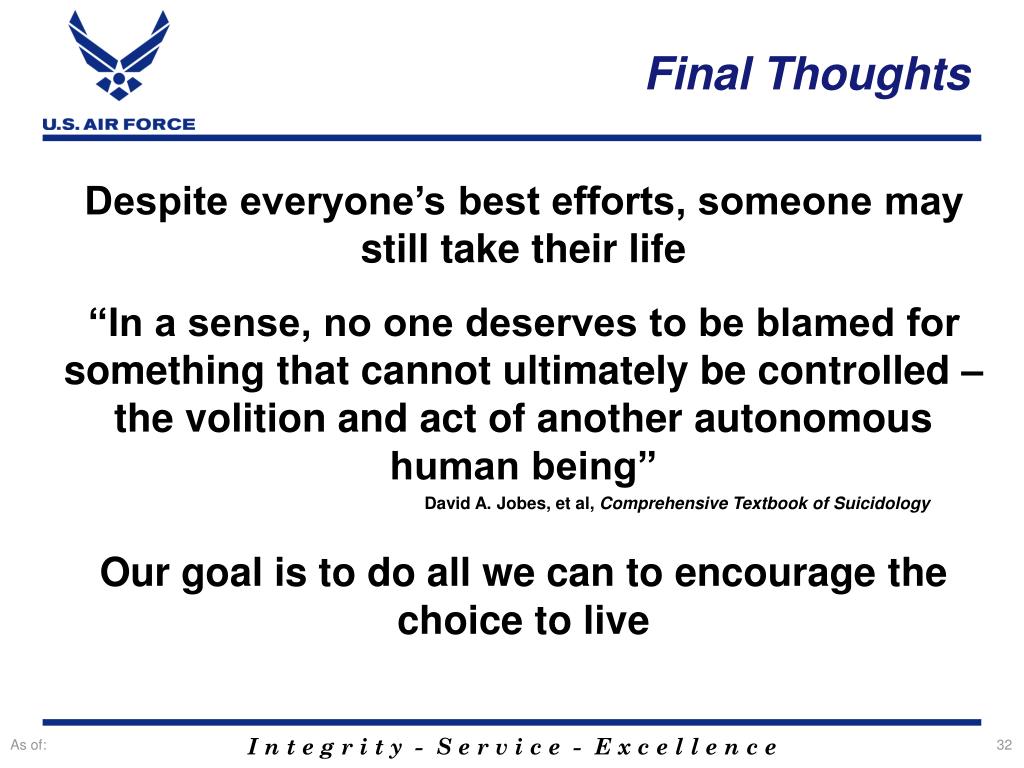 Final Thoughts Despite everyone’s best efforts, someone may still take their life “In a sense, no one deserves to be blamed for something that cannot ultimately be controlled – the volition and act of another autonomous human being” David A. Jobes, et al, Comprehensive Textbook of Suicidology Our goal is to do all we can to encourage the choice to live