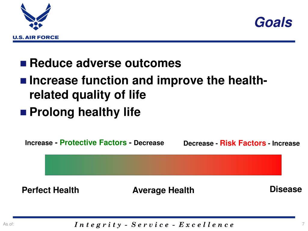 Increase - Protective Factors - Decrease Decrease - Risk Factors - Increase Disease Perfect Health Average Health Goals • Reduce adverse outcomes • Increase function and improve the health-related quality of life • Prolong healthy life
