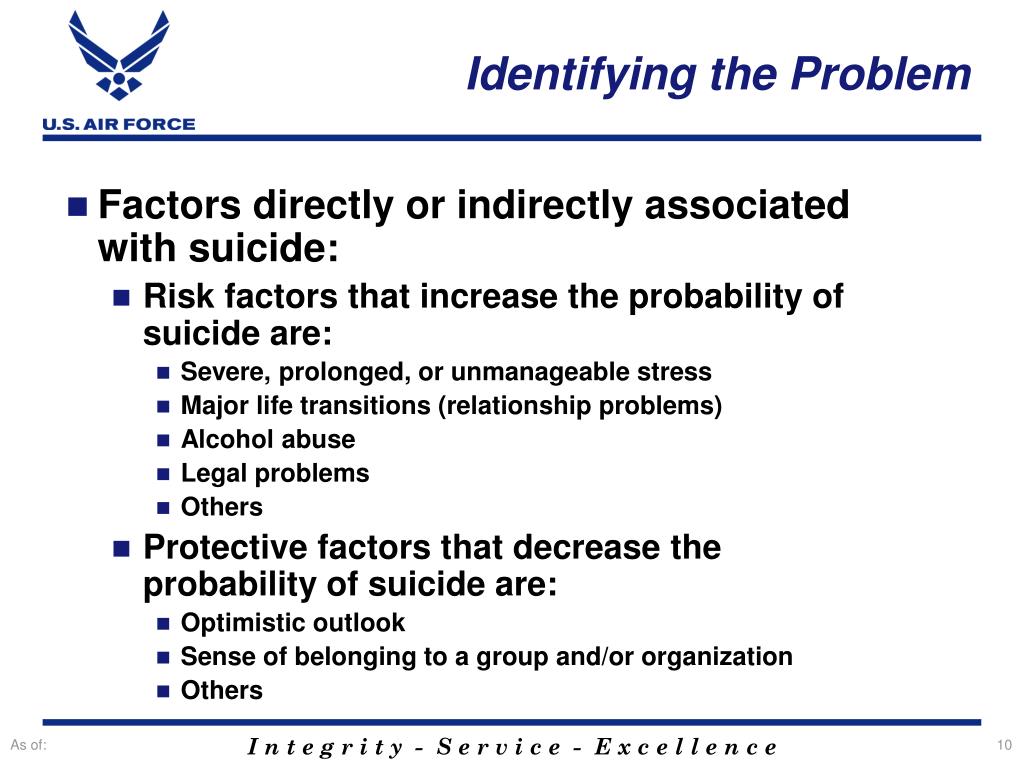 Identifying the Problem • Factors directly or indirectly associated with suicide: • Risk factors that increase the probability of suicide are: • Severe, prolonged, or unmanageable stress • Major life transitions (relationship problems) • Alcohol abuse • Legal problems • Others • Protective factors that decrease the probability of suicide are: • Optimistic outlook • Sense of belonging to a group and/or organization • Others