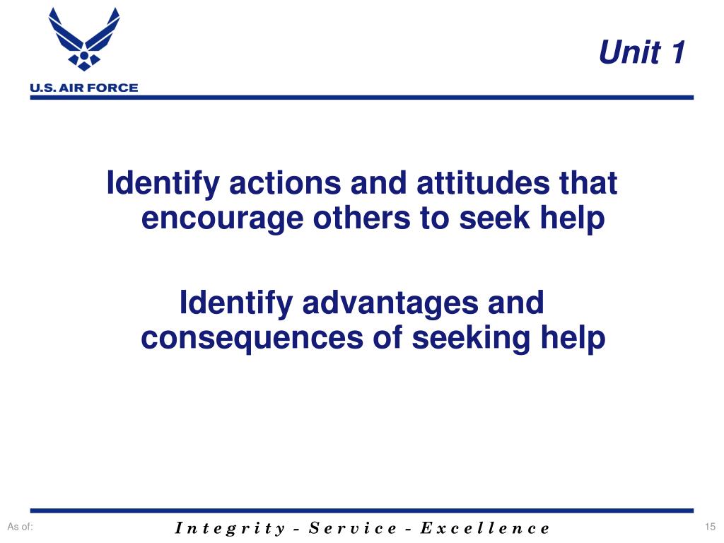 Unit 1: Actions and Attitudes that Encourage Others to Seek Help • Self-Referral • Best option • Individual maintains control • Increased motivation for change • Focus on resolving the problem • AFI 44-109, Mental Health, Confidentiality, and Military Law • Air Force policy to encourage seeking help • Commander/supervisor should encourage