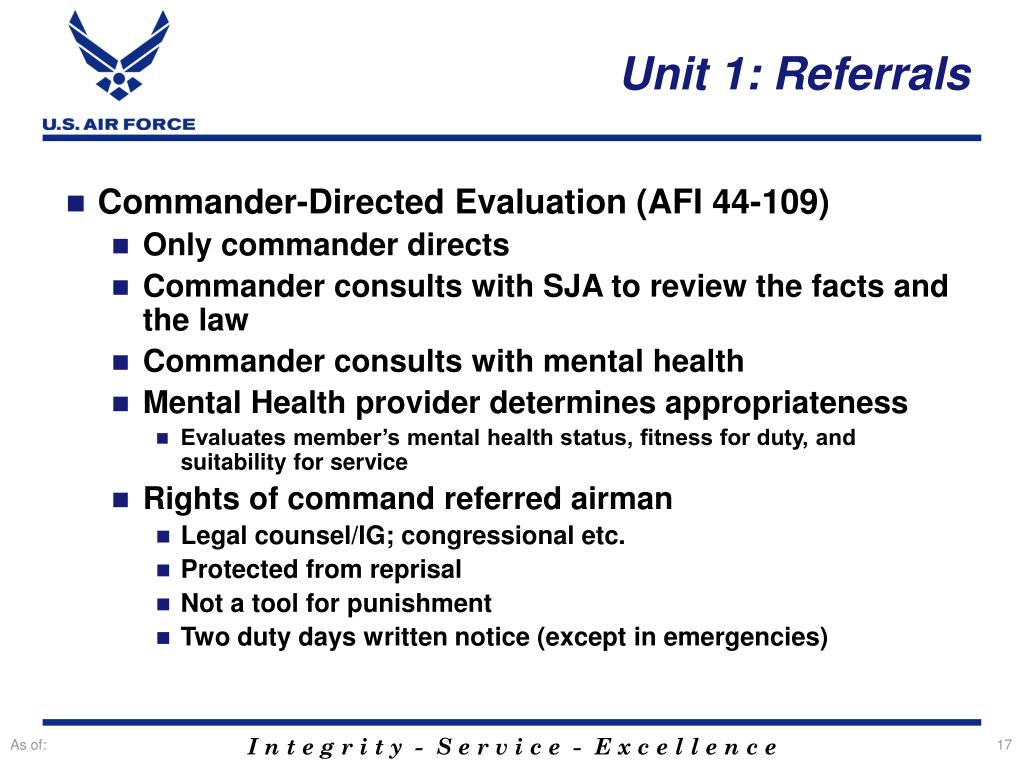 Unit 1: Referrals • Commander-Directed Evaluation (AFI 44-109) • Only commander directs • Commander consults with SJA to review the facts and the law • Commander consults with mental health • Mental Health provider determines appropriateness • Evaluates member’s mental health status, fitness for duty, and suitability for service • Rights of command referred airman • Legal counsel/IG; congressional etc. • Protected from reprisal • Not a tool for punishment • Two duty days written notice (except in emergencies)