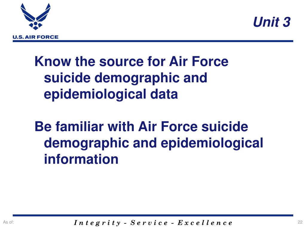 Unit 3 Know the source for Air Force suicide demographic and epidemiological data Be familiar with Air Force suicide demographic and epidemiological information