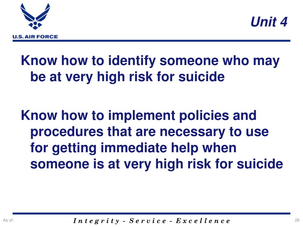 Unit 4 Know how to identify someone who may be at very high risk for suicide Know how to implement policies and procedures that are necessary to use for getting immediate help when someone is at very high risk for suicide