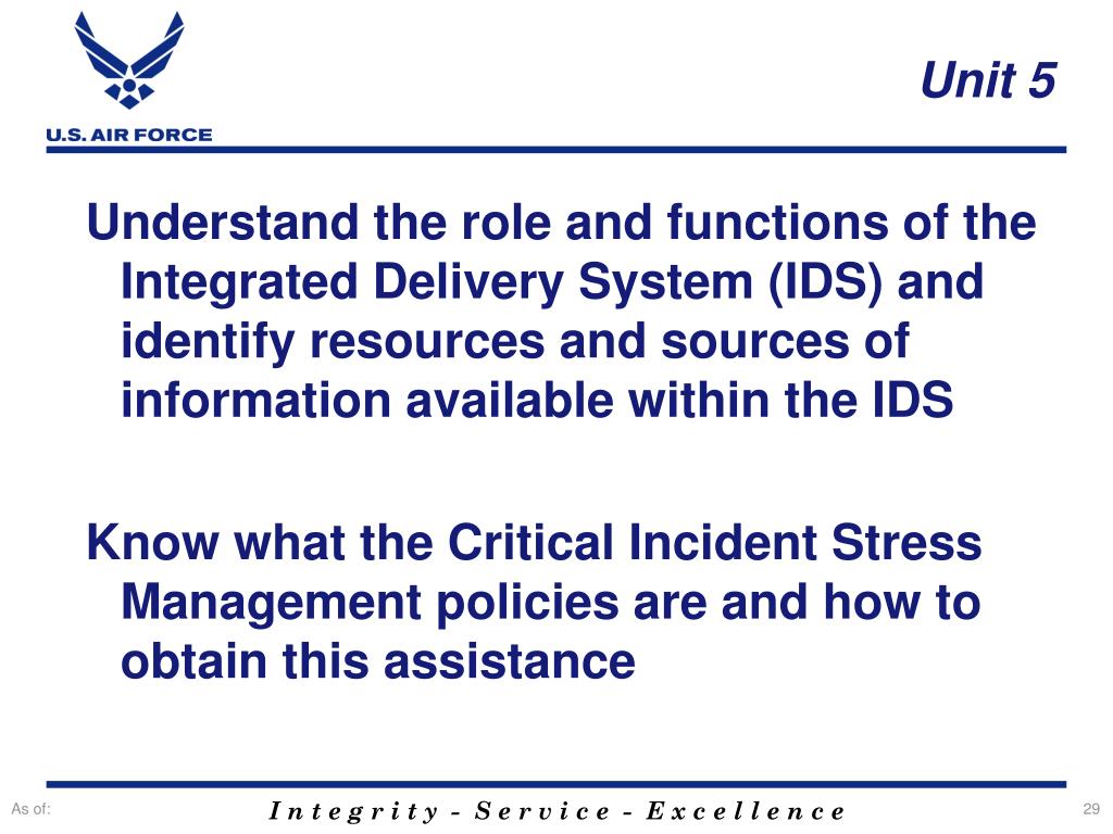 Unit 5 Understand the role and functions of the Integrated Delivery System (IDS) and identify resources and sources of information available within the IDS Know what the Critical Incident Stress Management policies are and how to obtain this assistance