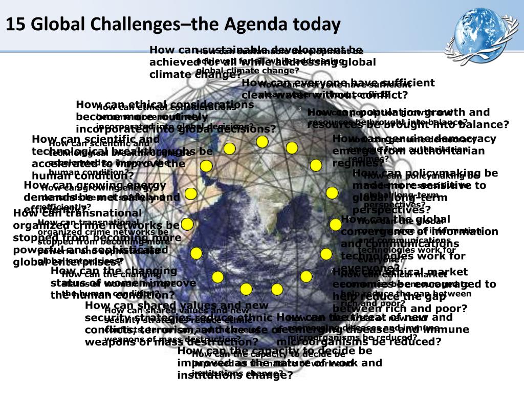 15 Global Challenges–the Agenda today How can sustainable development be achieved for all while addressing global climate change? How can sustainable development be achieved for all while addressing global climate change? 1 How can everyone have sufficient clean water without conflict? 2 How can everyone have sufficient clean water without conflict? How can ethical considerations become more routinely incorporated into global decisions? 15 How can ethical considerations become more routinely incorporated into global decisions? 3 How can population growth and resources be brought into balance? How can population growth and resources be brought into balance? How can genuine democracy emerge from authoritarian regimes? 4 How can scientific and technological breakthroughs be accelerated to improve the human condition? How can genuine democracy emerge from authoritarian regimes? 14 How can scientific and technological breakthroughs be accelerated to improve the human condition? How can policymaking be made more sensitive to global long-term perspectives? 5 How can policymaking be made more sensitive to global long-term perspectives? How can growing energy demands be met safely and efficiently? 13 How can growing energy demands be met safely and efficiently? How can transnational organized crime networks be stopped from becoming more powerful and sophisticated global enterprises? How can the global convergence of information and communications technologies work for everyone? 6 How can the global convergence of information and communications technologies work for everyone? 12 How can transnational organized crime networks be stopped from becoming more powerful and sophisticated global enterprises? How can the changing status of women improve the human condition? How can ethical market economies be encouraged to help reduce the gap between rich and poor? 7 11 How can the changing status of women improve the human condition? How can ethical market economies be encouraged to help reduce the gap between rich and poor? How can shared values and new security strategies reduce ethnic conflicts, terrorism, and the use of weapons of mass destruction? How can shared values and new security strategies reduce ethnic conflicts, terrorism, and the use of weapons of mass destruction? 10 8 How can the threat of new and reemerging diseases and immune microorganisms be reduced? How can the threat of new and reemerging diseases and immune microorganisms be reduced? How can the capacity to decide be improved as the nature of work and institutions change? How can the capacity to decide be improved as the nature of work and institutions change? 9