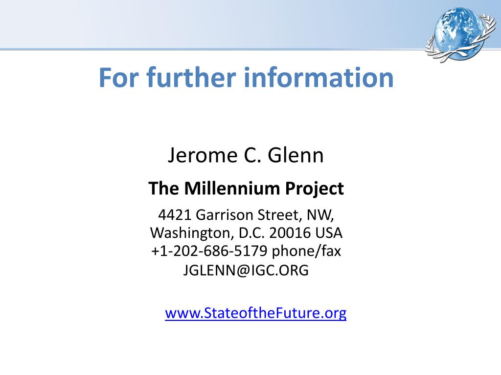 For further information Jerome C. Glenn The Millennium Project 4421 Garrison Street, NW, Washington, D.C. 20016 USA +1-202-686-5179 phone/fax JGLENN@IGC.ORG www.StateoftheFuture.org