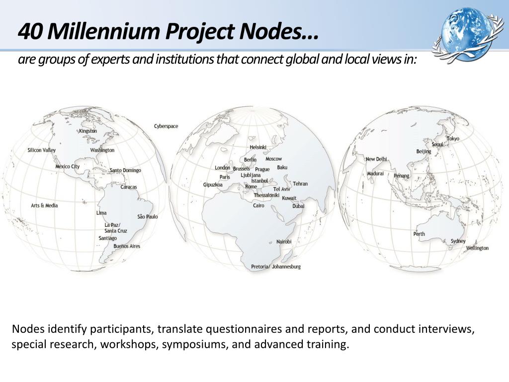 40 Millennium Project Nodes... are groups of experts and institutions that connect global and local views in:. Nodes identify participants, translate questionnaires and reports, and conduct interviews, special research, workshops, symposiums, and advanced training.