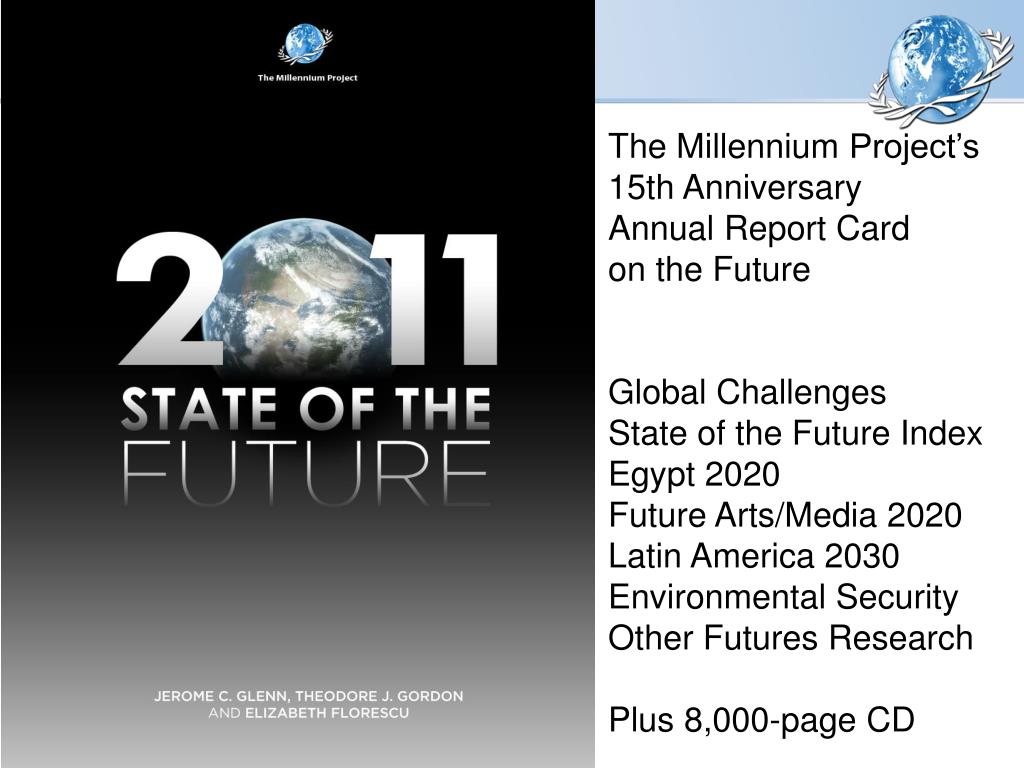 The Millennium Project’s 15th Anniversary Annual Report Card on the Future Global Challenges State of the Future Index Egypt 2020 Future Arts/Media 2020 Latin America 2030 Environmental Security Other Futures Research Plus 8,000-page CD