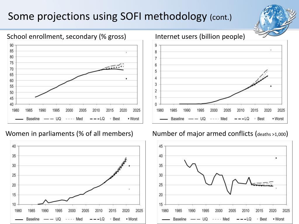 Some projections using SOFI methodology (cont.) School enrollment, secondary (% gross) Internet users (billion people) Women in parliaments (% of all members) Number of major armed conflicts (deaths >1,000)