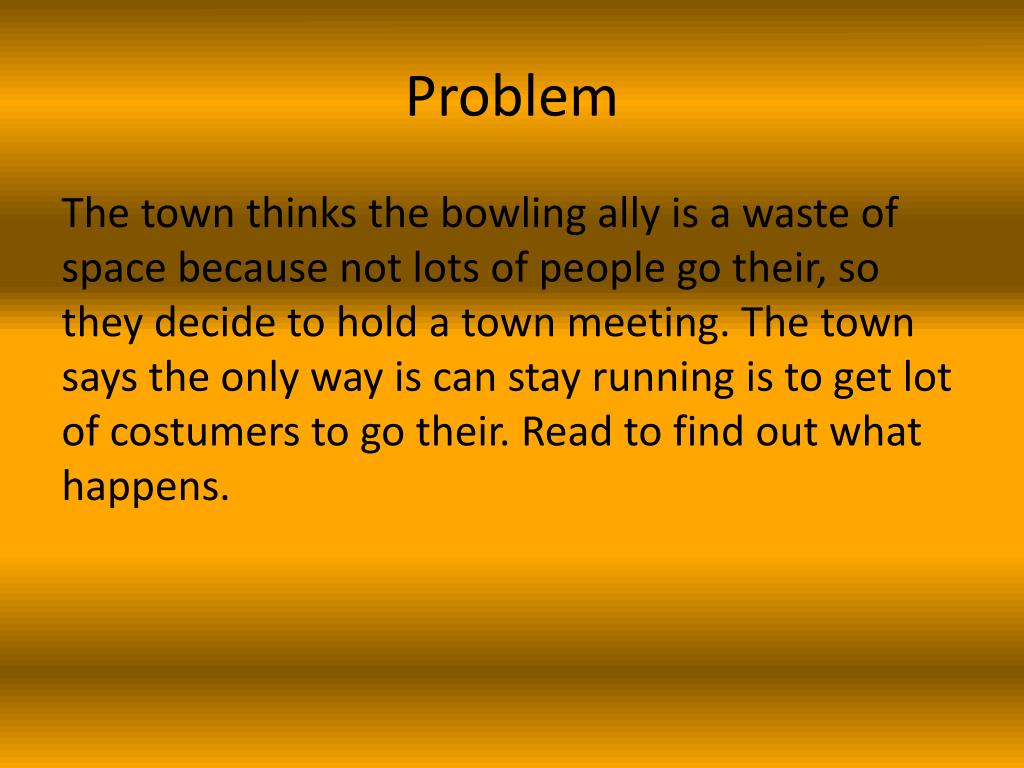 Problem The town thinks the bowling ally is a waste of space because not lots of people go their, so they decide to hold a town meeting. The town says the only way is can stay running is to get lot of costumers to go their. Read to find out what happens.