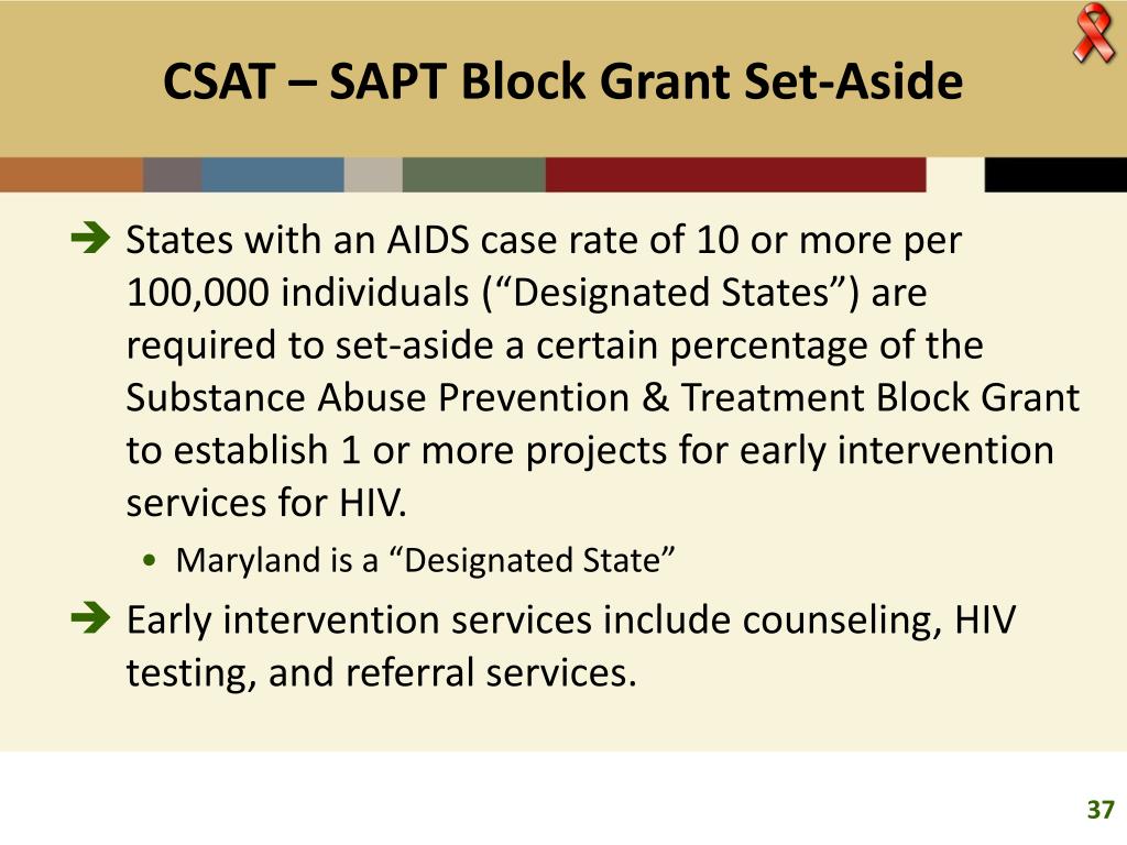 CSAT – SAPT Block Grant Set-Aside States with an AIDS case rate of 10 or more per 100,000 individuals (“Designated States”) are required to set-aside a certain percentage of the Substance Abuse Prevention & Treatment Block Grant to establish 1 or more projects for early intervention services for HIV. Maryland is a “Designated State” Early intervention services include counseling, HIV testing, and referral services. 37
