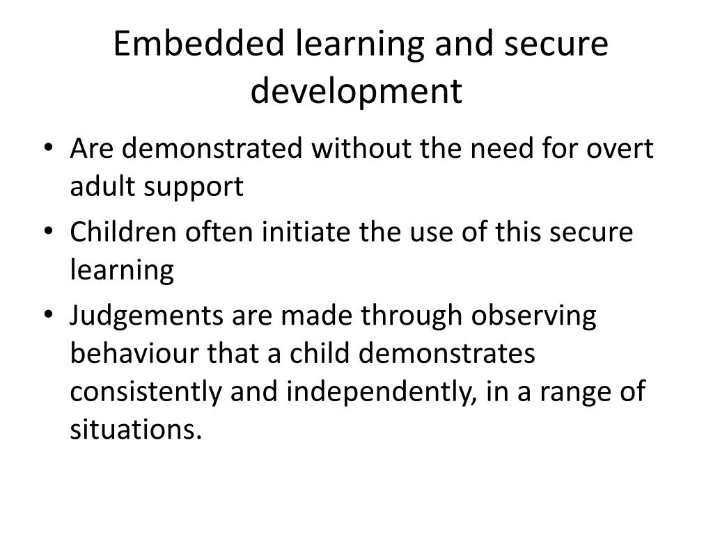 Embedded learning and secure development • Are demonstrated without the need for overt adult support • Children often initiate the use of this secure learning • Judgements are made through observing behaviour that a child demonstrates consistently and independently, in a range of situations.