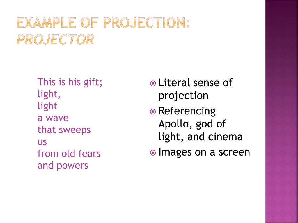 Example of Projection: Projector • Literal sense of projection • Referencing Apollo, god of light, and cinema • Images on a screen This is his gift;light,lighta wavethat sweepsus from old fearsand powers