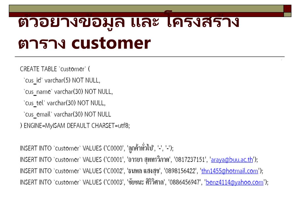 ตัวอย่างข้อมูล และ โครงสร้างตาราง customer