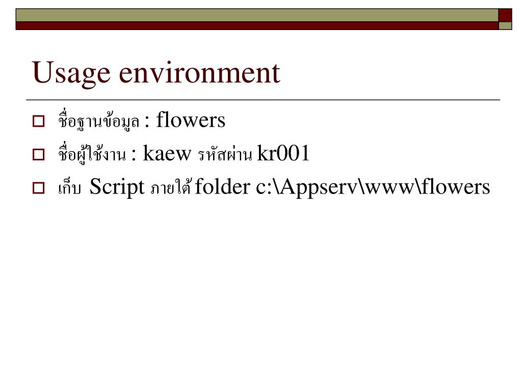 Usage environment • ชื่อฐานข้อมูล : flowers • ชื่อผู้ใช้งาน : kaewรหัสผ่าน kr001 • เก็บ Script ภายใต้ folder c:\Appserv\www\flowers