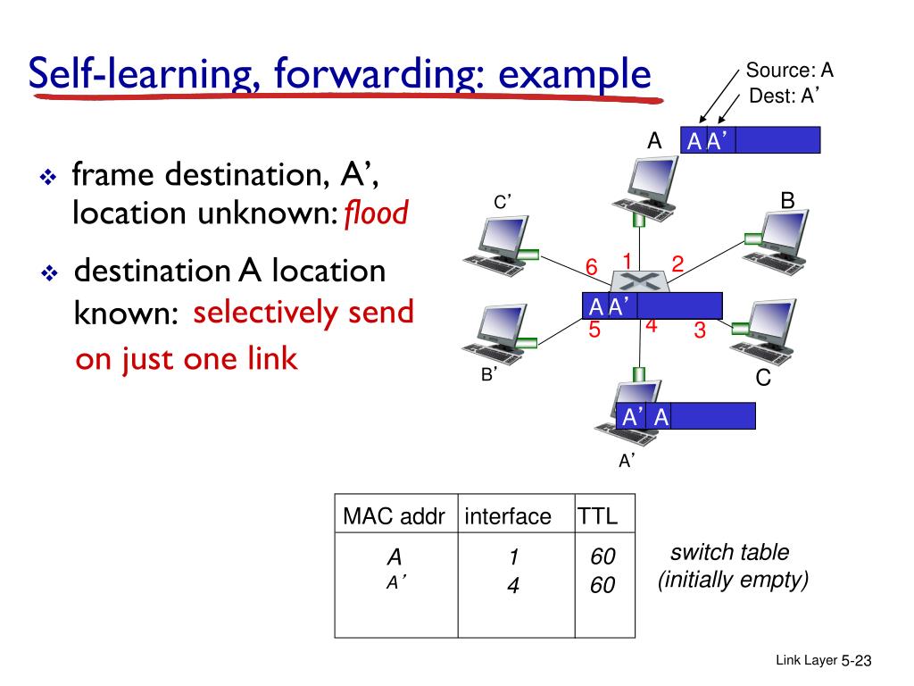Switch forwarding table Q:how does switch know A’ reachable via interface 4, and B’ reachable via interface 5? A B C’ • A:each switch has a switch table,each entry: • (MAC address of host, interface to reach host, time stamp) • looks like a routing table! 1 2 6 4 5 3 B’ C Q:how are entries created, maintained in switch table? • something like a routing protocol? A’ switch with six interfaces (1,2,3,4,5,6) Link Layer