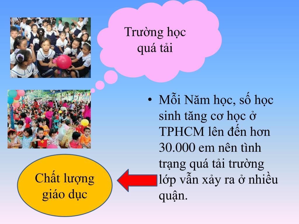 Trườnghọc quá tải • MỗiNăm học, số học sinh tăng cơ học ở TPHCM lên đến hơn 30.000 em nên tình trạng quá tải trường lớp vẫn xảy ra ở nhiều quận. Chấtlượnggiáodục