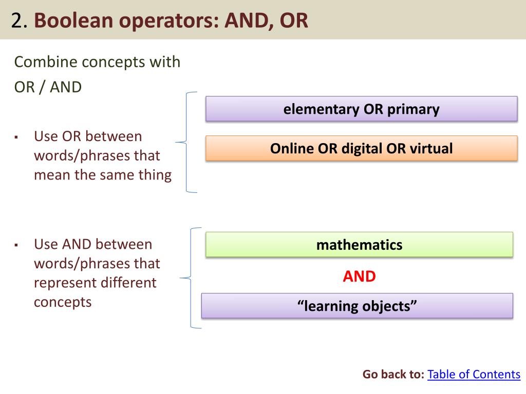 2. Boolean operators: AND, OR Combine concepts with OR / AND • Use OR between words/phrases that mean the same thing • Use AND between words/phrases that represent different concepts elementary OR primary Online OR digital OR virtual mathematics AND “learning objects” Go back to: Table of Contents