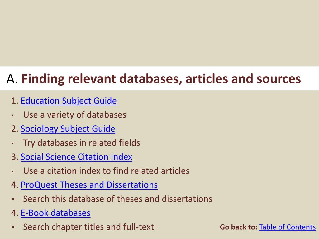 A. Finding relevant databases, articles and sources 1. Education Subject Guide • Use a variety of databases 2. Sociology Subject Guide • Try databases in related fields 3. Social Science Citation Index • Use a citation index to find related articles 4. ProQuest Theses and Dissertations • Search this database of theses and dissertations 4. E-Book databases • Search chapter titles and full-text Go back to: Table of Contents