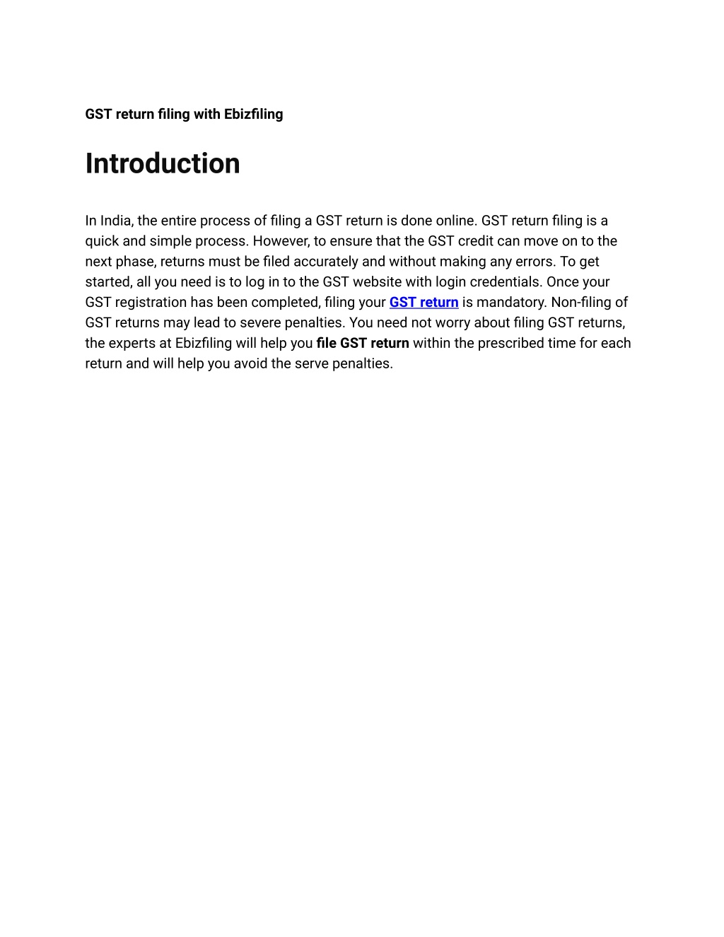 GST return filing with Ebizfiling Introduction In India, the entire process of filing a GST return is done online. GST return filing is a quick and simple process. However, to ensure that the GST credit can move on to the next phase, returns must be filed accurately and without making any errors. To get started, all you need is to log in to the GST website with login credentials. Once your GST registration has been completed, filing your GST return is mandatory. Non-filing of GST returns may lead to severe penalties. You need not worry about filing GST returns, the experts at Ebizfiling will help you file GST return within the prescribed time for each return and will help you avoid the serve penalties.