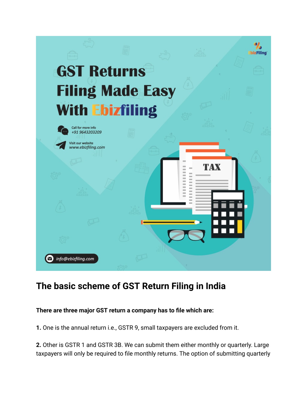 The basic scheme of GST Return Filing in India There are three major GST return a company has to file which are: 1. One is the annual return i.e., GSTR 9, small taxpayers are excluded from it. 2. Other is GSTR 1 and GSTR 3B. We can submit them either monthly or quarterly. Large taxpayers will only be required to file monthly returns. The option of submitting quarterly
