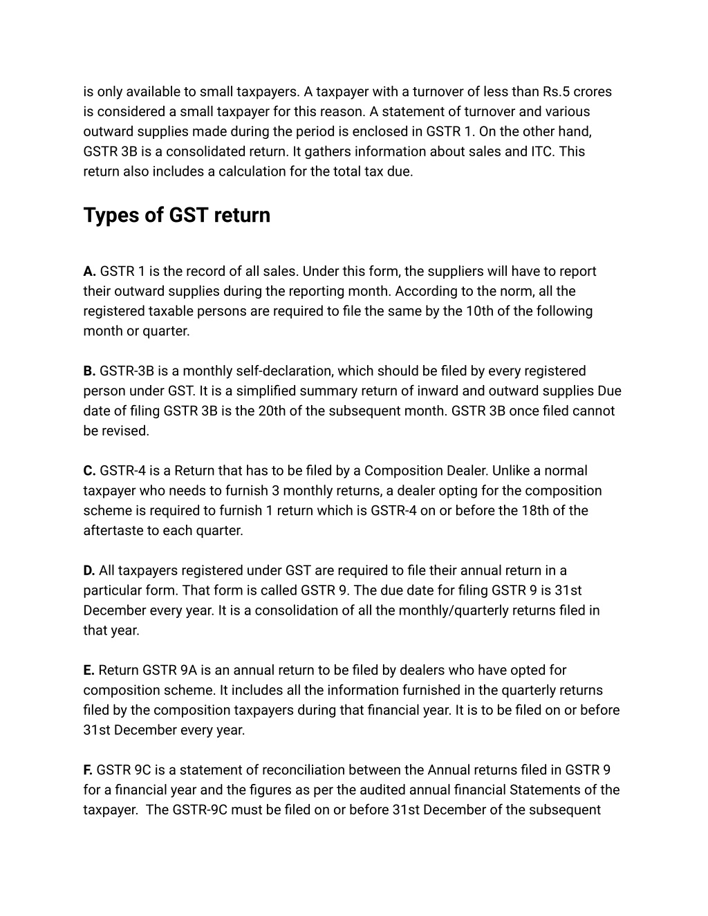 is only available to small taxpayers. A taxpayer with a turnover of less than Rs.5 crores is considered a small taxpayer for this reason. A statement of turnover and various outward supplies made during the period is enclosed in GSTR 1. On the other hand, GSTR 3B is a consolidated return. It gathers information about sales and ITC. This return also includes a calculation for the total tax due. Types of GST return A. GSTR 1 is the record of all sales. Under this form, the suppliers will have to report their outward supplies during the reporting month. According to the norm, all the registered taxable persons are required to file the same by the 10th of the following month or quarter. B. GSTR-3B is a monthly self-declaration, which should be filed by every registered person under GST. It is a simplified summary return of inward and outward supplies Due date of filing GSTR 3B is the 20th of the subsequent month. GSTR 3B once filed cannot be revised. C. GSTR-4 is a Return that has to be filed by a Composition Dealer. Unlike a normal taxpayer who needs to furnish 3 monthly returns, a dealer opting for the composition scheme is required to furnish 1 return which is GSTR-4 on or before the 18th of the aftertaste to each quarter. D. All taxpayers registered under GST are required to file their annual return in a particular form. That form is called GSTR 9. The due date for filing GSTR 9 is 31st December every year. It is a consolidation of all the monthly/quarterly returns filed in that year. E. Return GSTR 9A is an annual return to be filed by dealers who have opted for composition scheme. It includes all the information furnished in the quarterly returns filed by the composition taxpayers during that financial year. It is to be filed on or before 31st December every year. F. GSTR 9C is a statement of reconciliation between the Annual returns filed in GSTR 9 for a financial year and the figures as per the audited annual financial Statements of the taxpayer. The GSTR-9C must be filed on or before 31st December of the subsequent