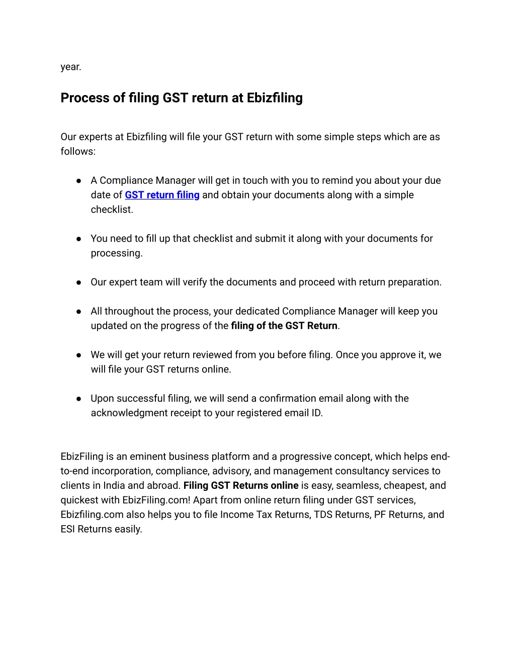 year. Process of filing GST return at Ebizfiling Our experts at Ebizfiling will file your GST return with some simple steps which are as follows: ● A Compliance Manager will get in touch with you to remind you about your due date of GST return filing and obtain your documents along with a simple checklist. ● You need to fill up that checklist and submit it along with your documents for processing. ● Our expert team will verify the documents and proceed with return preparation. ● All throughout the process, your dedicated Compliance Manager will keep you updated on the progress of the filing of the GST Return. ● We will get your return reviewed from you before filing. Once you approve it, we will file your GST returns online. ● Upon successful filing, we will send a confirmation email along with the acknowledgment receipt to your registered email ID. EbizFiling is an eminent business platform and a progressive concept, which helps end- to-end incorporation, compliance, advisory, and management consultancy services to clients in India and abroad. Filing GST Returns online is easy, seamless, cheapest, and quickest with EbizFiling.com! Apart from online return filing under GST services, Ebizfiling.com also helps you to file Income Tax Returns, TDS Returns, PF Returns, and ESI Returns easily.