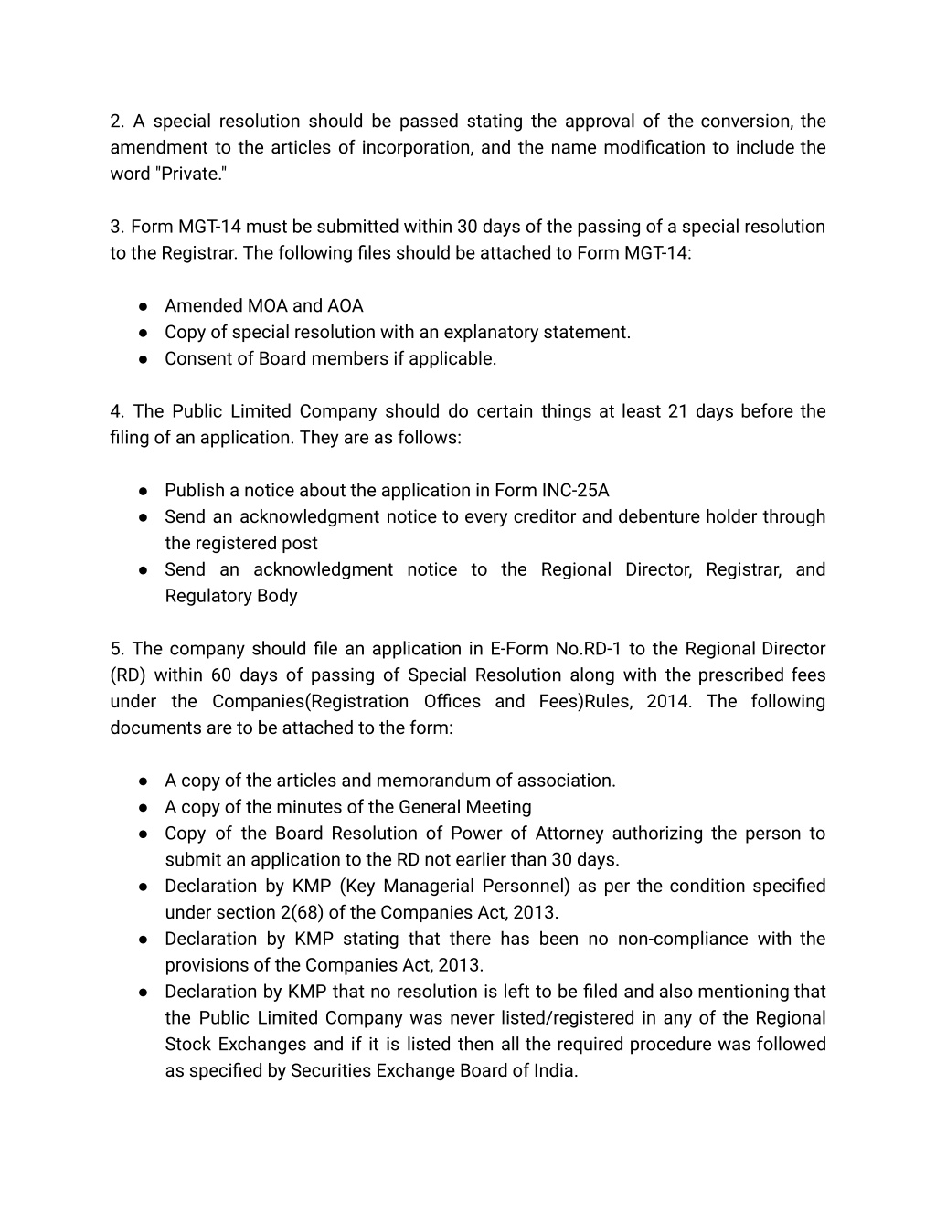 2. A special resolution should be passed stating the approval of the conversion, the amendment to the articles of incorporation, and the name modification to include the word "Private." 3. Form MGT-14 must be submitted within 30 days of the passing of a special resolution to the Registrar. The following files should be attached to Form MGT-14: ● Amended MOA and AOA ● Copy of special resolution with an explanatory statement. ● Consent of Board members if applicable. 4. The Public Limited Company should do certain things at least 21 days before the filing of an application. They are as follows: ● Publish a notice about the application in Form INC-25A ● Send an acknowledgment notice to every creditor and debenture holder through the registered post ● Send an acknowledgment notice to the Regional Director, Registrar, and Regulatory Body 5. The company should file an application in E-Form No.RD-1 to the Regional Director (RD) within 60 days of passing of Special Resolution along with the prescribed fees under the Companies(Registration Offices and Fees)Rules, 2014. The following documents are to be attached to the form: ● A copy of the articles and memorandum of association. ● A copy of the minutes of the General Meeting ● Copy of the Board Resolution of Power of Attorney authorizing the person to submit an application to the RD not earlier than 30 days. ● Declaration by KMP (Key Managerial Personnel) as per the condition specified under section 2(68) of the Companies Act, 2013. ● Declaration by KMP stating that there has been no non-compliance with the provisions of the Companies Act, 2013. ● Declaration by KMP that no resolution is left to be filed and also mentioning that the Public Limited Company was never listed/registered in any of the Regional Stock Exchanges and if it is listed then all the required procedure was followed as specified by Securities Exchange Board of India.