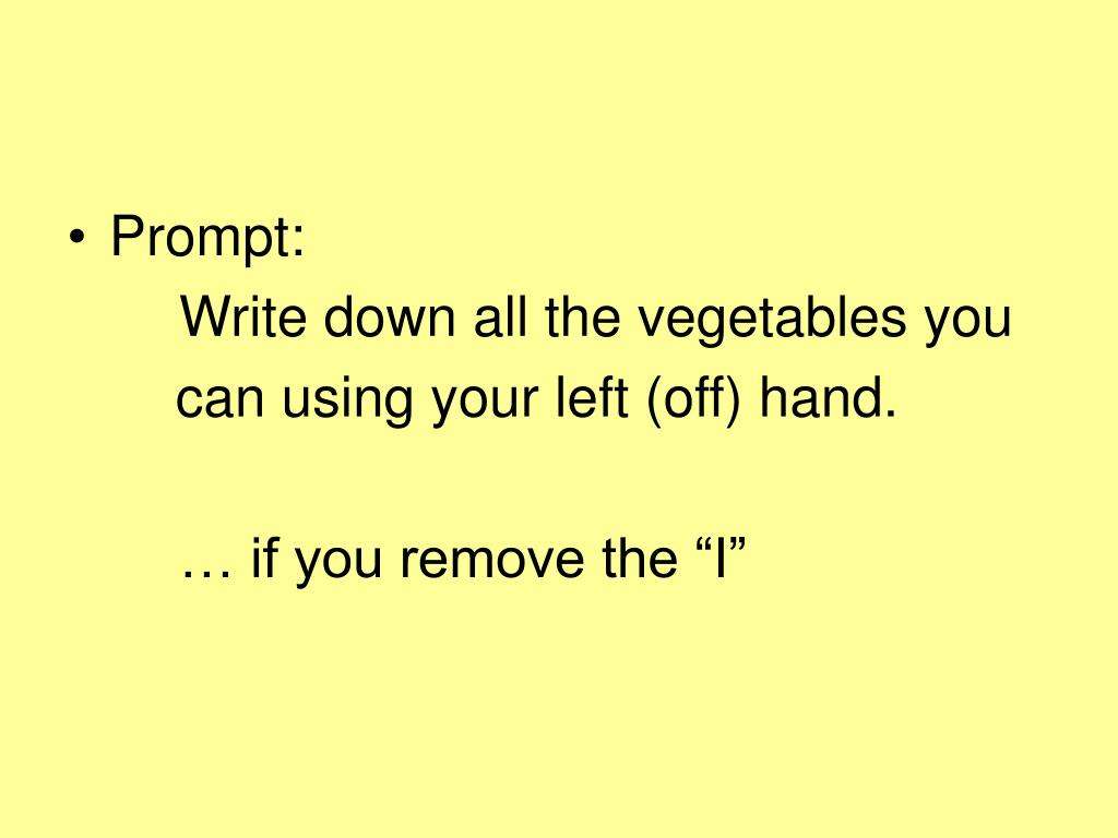 Prompt: Write down all the vegetables you can using your left (off) hand. … if you remove the “I”