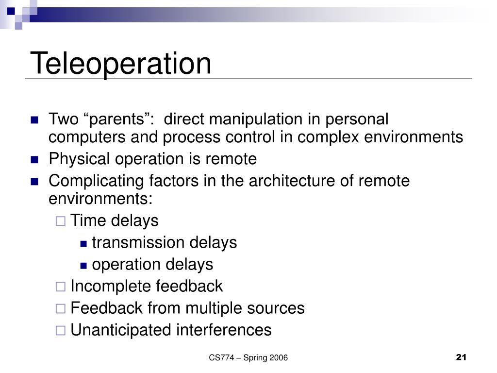 Teleoperation • Two “parents”: direct manipulation in personal computers and process control in complex environments • Physical operation is remote • Complicating factors in the architecture of remote environments: • Time delays • transmission delays • operation delays • Incomplete feedback • Feedback from multiple sources • Unanticipated interferences CS774 – Spring 2006