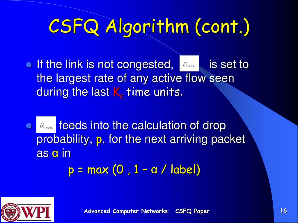 CSFQ Algorithm When a packet arrives, is updated using exponential averaging (equation 5). If the packet is dropped, remains the same. If the packet is not dropped, is updated using exponential averaging. At the end of an epoch (defined by Kc), if the link is congested during the whole epoch, update : Advanced Computer Networks: CSFQ Paper