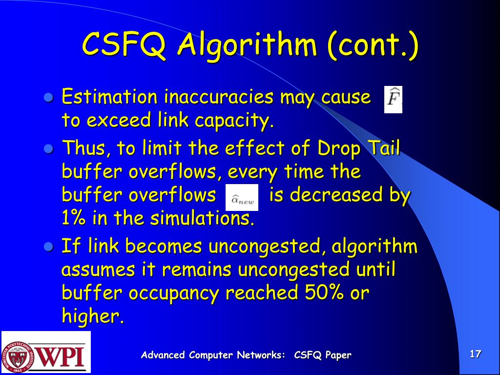 CSFQ Algorithm (cont.) • Estimation inaccuracies may cause to exceed link capacity. • Thus, to limit the effect of Drop Tail buffer overflows, every time the buffer overflows is decreased by 1% in the simulations. • If link becomes uncongested, algorithm assumes it remains uncongested until buffer occupancy reached 50% or higher. Advanced Computer Networks: CSFQ Paper