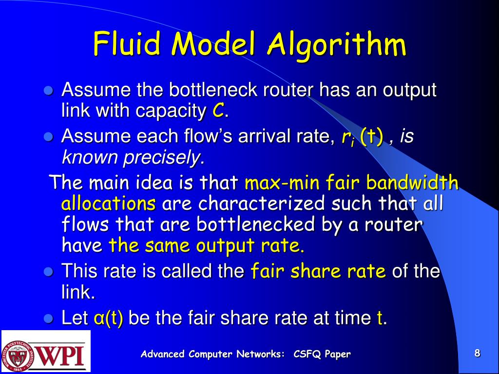 Fluid Model Algorithm • Assume the bottleneck router has an output link with capacity C. • Assume each flow’s arrival rate, ri (t), is known precisely. The main idea is that max-min fair bandwidth allocations are characterized such that all flows that are bottlenecked by a router have the same output rate. • This rate is called the fair share rate of the link. • Let α(t) be the fair share rate at time t. Advanced Computer Networks: CSFQ Paper