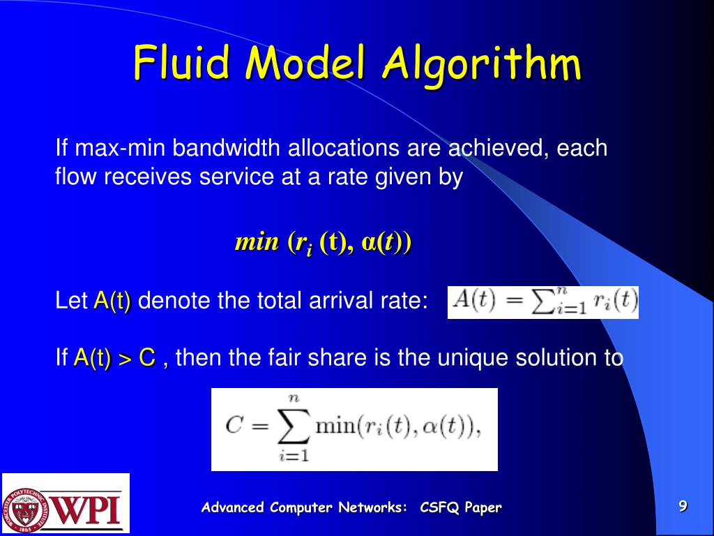 Fluid Model Algorithm If max-min bandwidth allocations are achieved, each flow receives service at a rate given by min (ri (t), α(t)) Let A(t) denote the total arrival rate: If A(t) > C , then the fair share is the unique solution to Advanced Computer Networks: CSFQ Paper