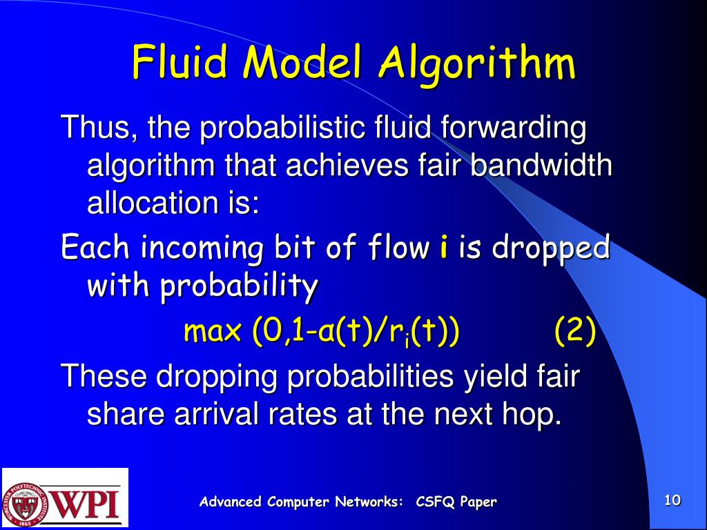 Fluid Model Algorithm Thus, the probabilistic fluid forwarding algorithm that achieves fair bandwidth allocation is: Each incoming bit of flowiis dropped with probability max (0,1-α(t)/ri(t)) (2) These dropping probabilities yield fair share arrival rates at the next hop. Advanced Computer Networks: CSFQ Paper