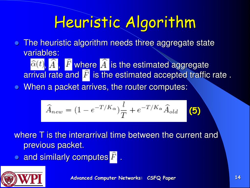 Heuristic Algorithm • The heuristic algorithm needs three aggregate state variables: , , where is the estimated aggregate arrival rate and is the estimated accepted traffic rate . • When a packet arrives, the router computes: (5) where T is the interarrival time between the current and previous packet. • and similarly computes . Advanced Computer Networks: CSFQ Paper