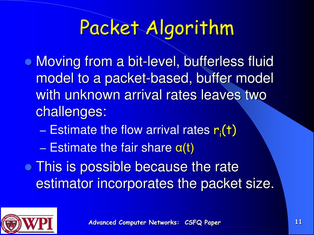 Packet Algorithm • Moving from a bit-level, bufferless fluid model to a packet-based, buffer model with unknown arrival rates leaves two challenges: • Estimate the flow arrival rates ri(t) • Estimate the fair share α(t) • This is possible because the rate estimator incorporates the packet size. Advanced Computer Networks: CSFQ Paper