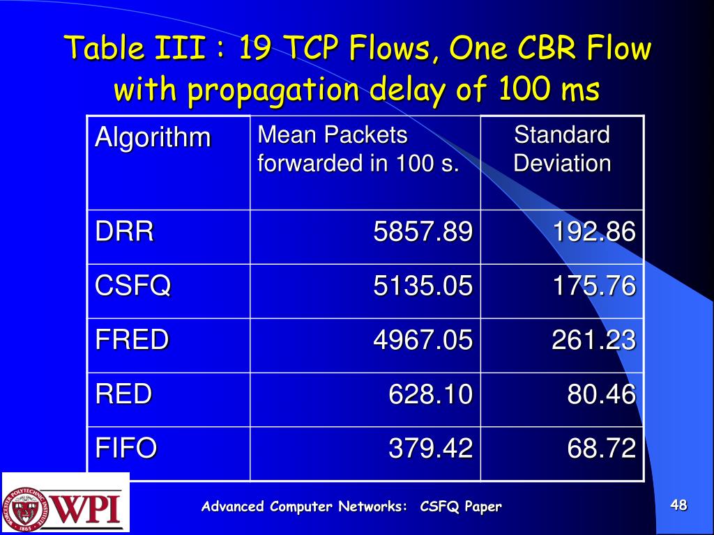 Table III :19 TCP Flows, One CBR Flow with propagation delay of 100 ms Advanced Computer Networks: CSFQ Paper