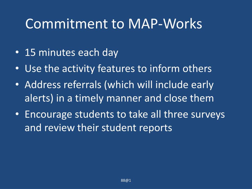 Commitment to MAP-Works • 15 minutes each day • Use the activity features to inform others • Address referrals (which will include early alerts) in a timely manner and close them • Encourage students to take all three surveys and review their student reports 88@1
