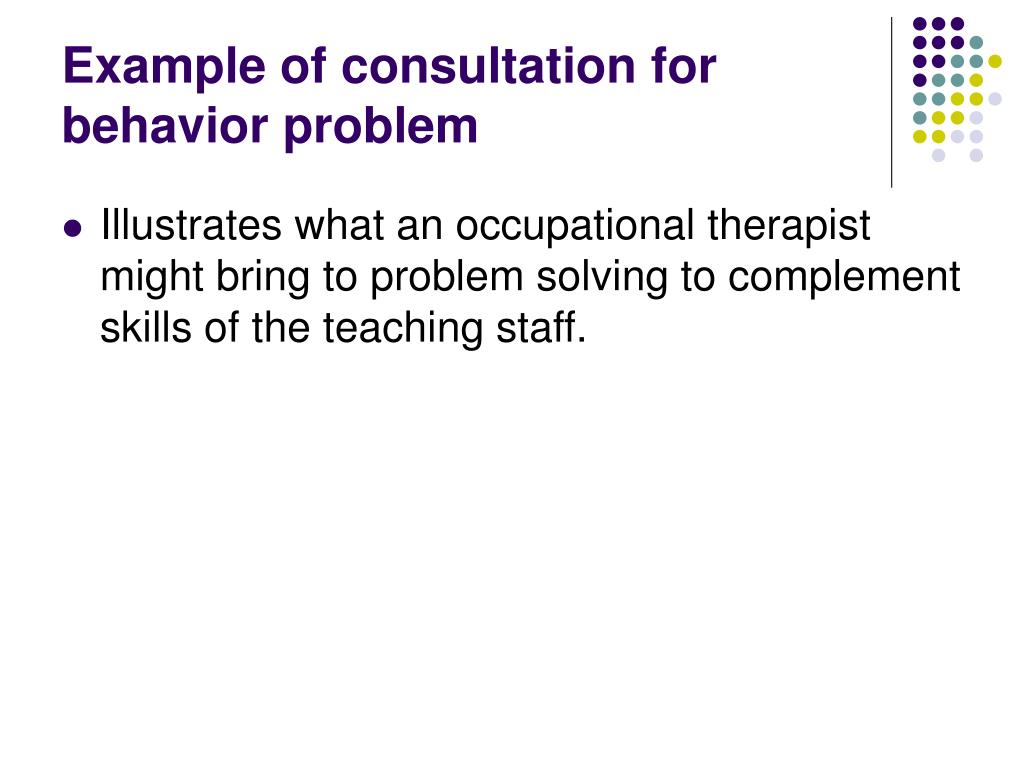 Example of consultation for behavior problem • Illustrates what an occupational therapist might bring to problem solving to complement skills of the teaching staff.