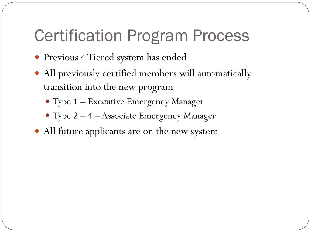 Certification Program Process • Previous 4 Tiered system has ended • All previously certified members will automatically transition into the new program • Type 1 – Executive Emergency Manager • Type 2 – 4 – Associate Emergency Manager • All future applicants are on the new system