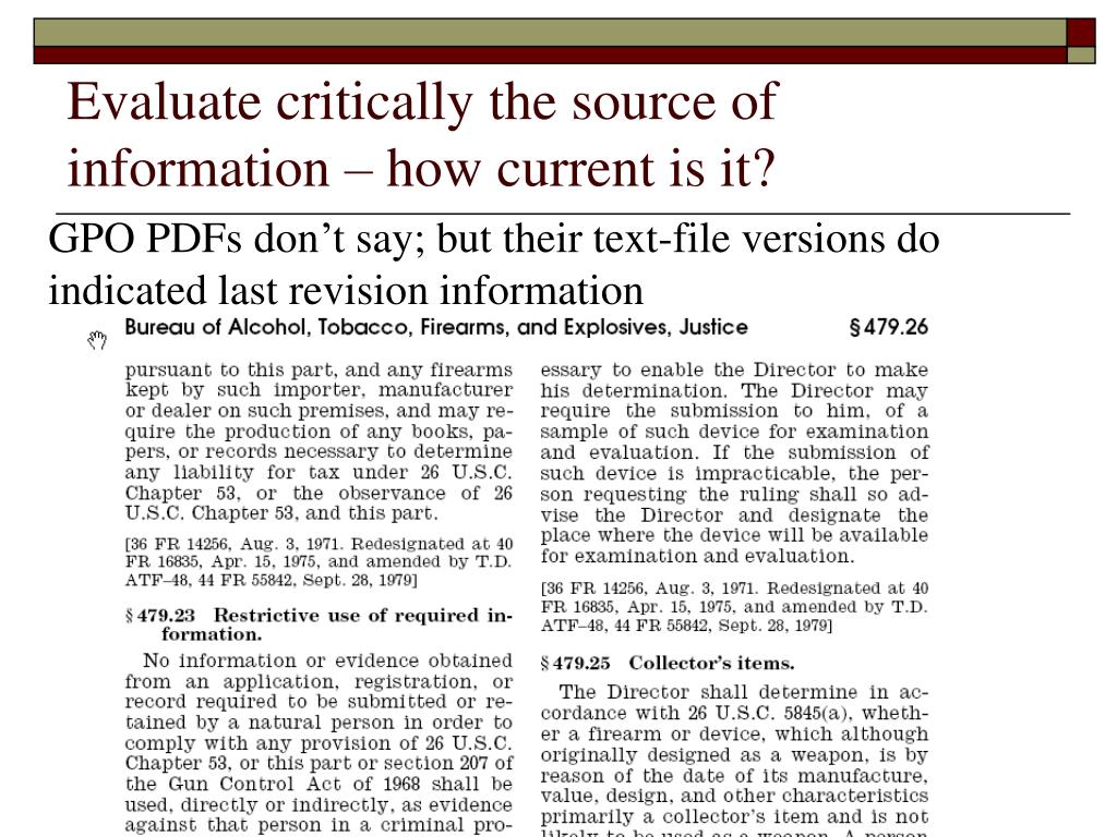 Evaluate critically the source of information Find Regulations for Gun Collectors on GPO Access How current are these results?