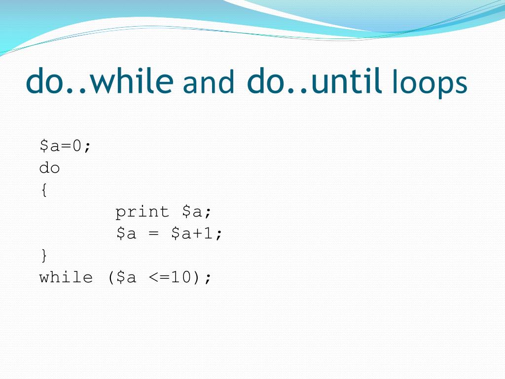 do..while and do..until loops $a=0; do { print $a; $a = $a+1; } while ($a <=10);