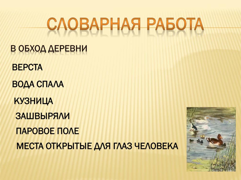 Словарная работа В ОБХОД ДЕРЕВНИ ВЕРСТА ВОДА СПАЛА КУЗНИЦА ЗАШВЫРЯЛИ ПАРОВОЕ ПОЛЕ МЕСТА ОТКРЫТЫЕ ДЛЯ ГЛАЗ ЧЕЛОВЕКА