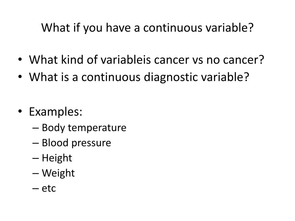 What if you have a continuous variable? • What kind of variableis cancer vs no cancer? • What is a continuous diagnostic variable? • Examples: • Body temperature • Blood pressure • Height • Weight • etc